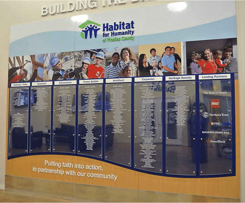 We would like to feature a wonderful client of ours: Habitat for Humanity of Pinellas County. While the display has been updated over the years as donations continue to pour in (one of the great things about a changeable panel donor wall), it remains just as pristine as the day it was installed.